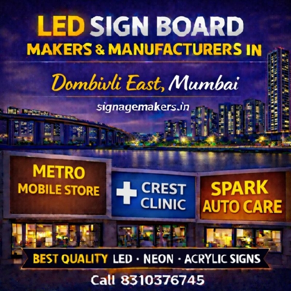 Welcome to signagemakers.in, a trusted name for LED Sign Board Makers & Manufacturers in Dombivli East, Mumbai. We are direct manufacturers providing high-quality LED sign boards that help businesses increase visibility, attract customers and build a strong professional brand image. Dombivli East is a busy residential...