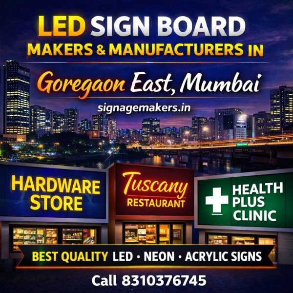 Welcome to signagemakers.in, your trusted LED Sign Board Makers & Manufacturers in Goregaon East, Mumbai. We specialize in designing and manufacturing high-quality LED sign boards that help businesses gain maximum visibility in busy commercial and retail locations. Goregaon East is a well-known business and industrial zone...