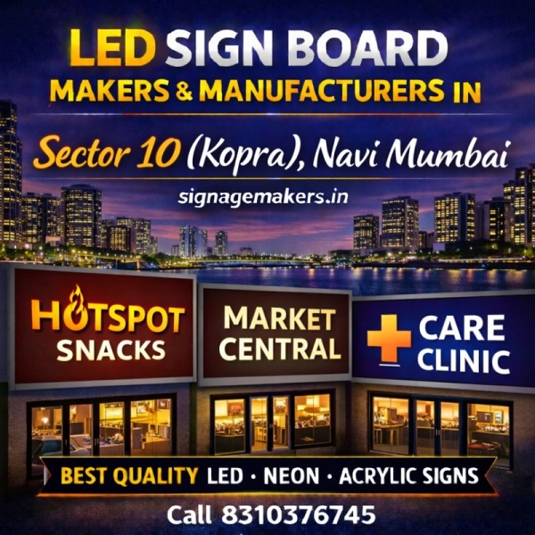 Welcome to signagemakers.in, a trusted name for LED Sign Board Makers & Manufacturers in Sector 10 (Kopra), Navi Mumbai. We specialize in manufacturing high-quality LED sign boards that help businesses improve visibility, attract customers and build a strong professional identity. Sector 10 (Kopra) is a developing...
